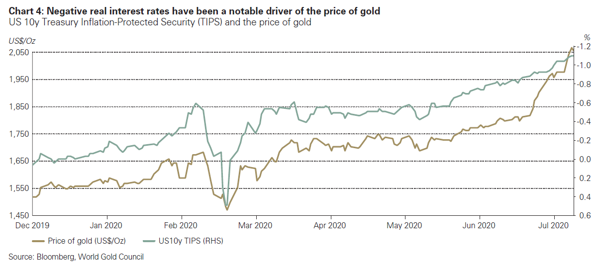 Real interest rates is represented by the US 10y Treasury Inflation-Protected Security (TIPS).