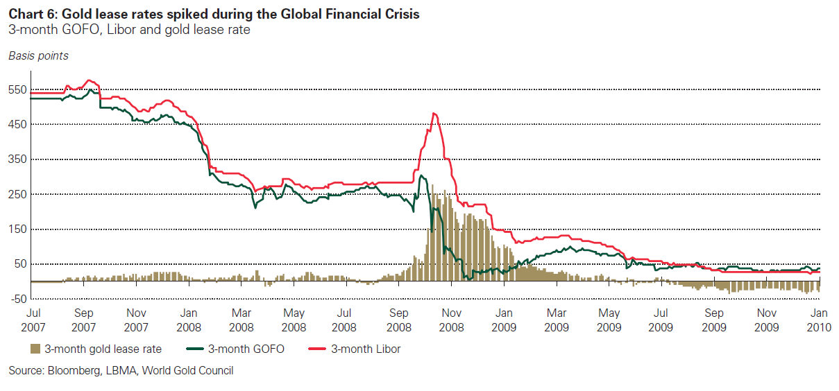 David Barclays and Christophe Duval-Kieffer in LBMA Alchemist issue 54 explained in greater detail the drivers behind the movements in GOFO and Libor during the financial crisis. Broadly, the authors compared both Libor and GOFO to the overnight indexed swap (OIS) and studied the inherent risk involved in the different funding rates.