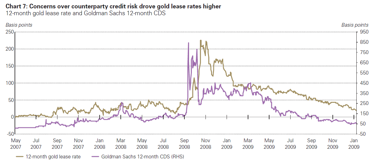 In his investigation of gold lease rates between 1995 and 1999, Ted Reeve, a commodity analyst at Scotia McLeod, attributed the spike in gold lease rates in November 1995 to the lack of gold available for lending amidst short speculative pressure. See also Bohm, Christian, (2010, June 18), “The Gold Lending Market”, page 15.