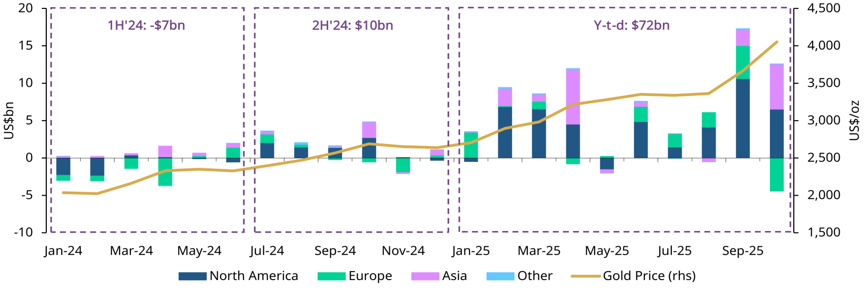 Gold ETF trading volumes surged to a record US$17bn/day (+100% m/m), led primarily by North American funds, which averaged US$12.5bn/day (+93% m/m) and accounted for roughly 75% of global physically backed ETF trading.