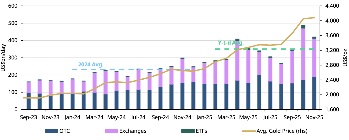 Gold market trading volumes pulled back, averaging US$417bn in November, down 26% compared to the record level set in October.5 Nonetheless, global gold volumes remain well above their 2024 average of US$232bn/day. With gold price volatility decreasing in the month, all sectors saw slower activity.