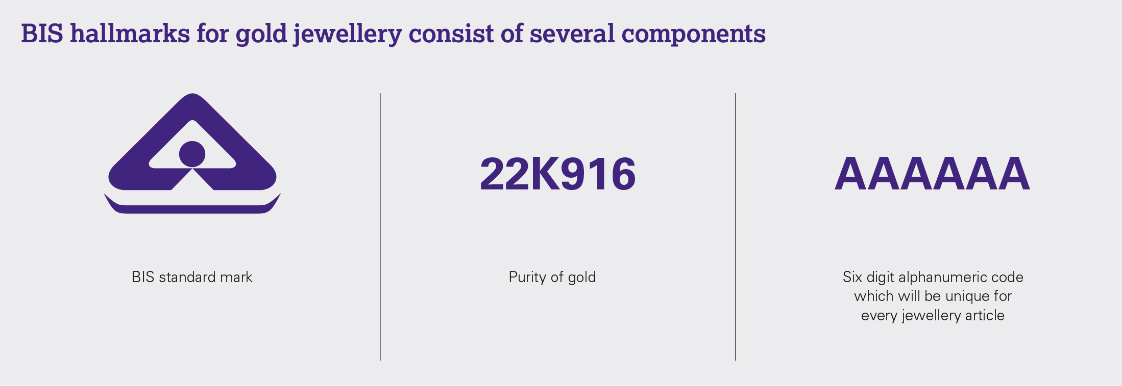 According to the BIS, the new hallmark consists of three symbols: the BIS logo, the purity and finesse, and the HUID number. Such traceability will enhance consumer confidence in the jewellery they buy. The government aims to create a central platform where consumers can look up an HUID number and see all details linked to that piece, notably the jewellery manufacturer, hallmarking and assaying centre, and the jeweller's name.