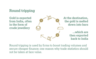 While the vast majority of Indian exports are genuine, there remains an element that is not. The practice of round tripping (RT) involves exporting gold (jewellery, bars or coins) with the sole purpose of the product being melted down and re-imported into the original exporting country. This circular flow of gold inflates trade statistics and in India is used by firms to artificially boost their trading volumes and, in turn, secure less expensive finance on the basis of a higher turnover. Due to various government programmes to promote overseas trade, export credit is usually less expensive, and inflating exports through round tripping allows exporters access to more credit at lower rates than other companies would pay.